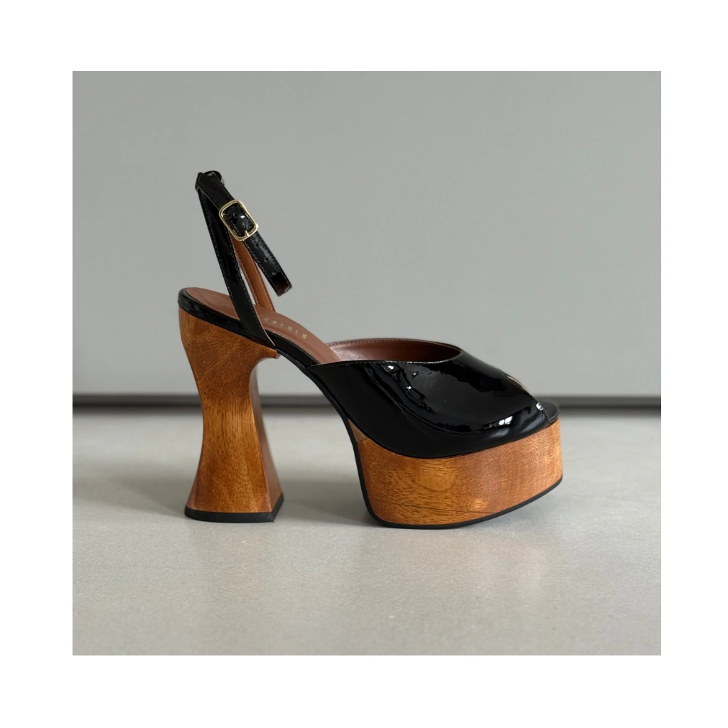 Conheça agora a sandália Kaya, feita em verniz preto e salto e plataforma e em madeira natural. Salto de 12 cm e a plataforma de 5 cm proporcionam a altura perfeita para elevar sua auto-estima e estilo.